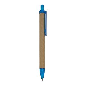 Descrição: Caneta de papelão com detalhes plásticos translúcidos, carga esferográfica azul e acionamento por clique.