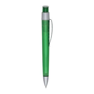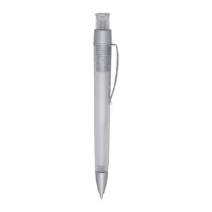 Descrição: Caneta plástica com clip metálico vazado, carga esferográfica azul e acionamento por clique.