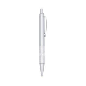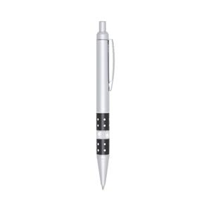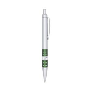 Descrição: Caneta plástica com detalhe strass, carga esferográfica azul e acionamento por clique.