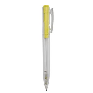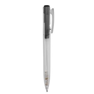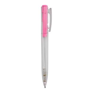 Descrição: Caneta plástica com carga esferográfica azul e acionamento por clique.