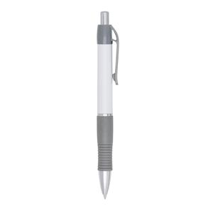 Descrição: Caneta plástica com detalhe emborrachado, carga esferográfica azul e acionamento por clique.