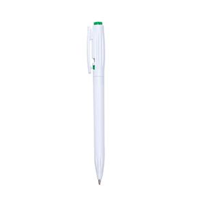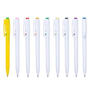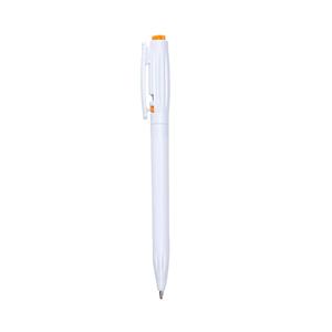 Descrição: Caneta plástica com carga esferográfica azul e acionamento por clique.