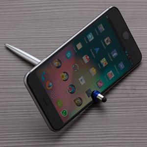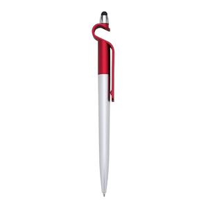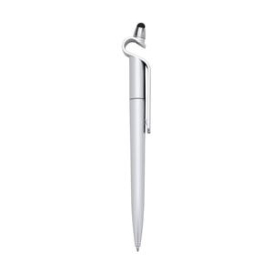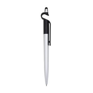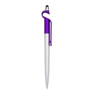 Descrição: Caneta plástica com suporte para celular e touch screen. Carga esferográfica azul e acionamento por rotação.