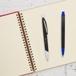 Descrição: Caneta plástica com carga esferográfica azul e acionamento por clique.