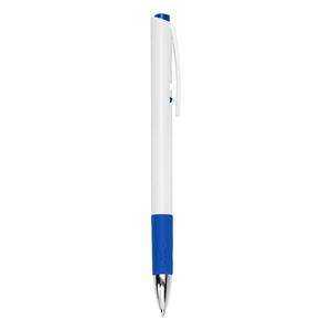 Descrição: Caneta plástica com detalhe emborrachado, carga esferográfica azul e acionamento por clique.