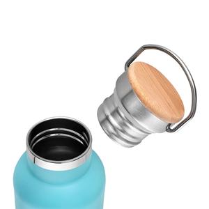 Descrição: Garrafa térmica em inox 500 ml, tampa rosqueável com revestimento em fibra de bambu, alça de metal.