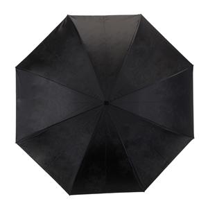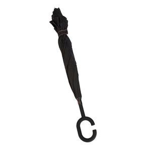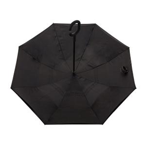Descrição: Guarda-chuva invertido com forro interno. Tecido de nylon impermeável preto, possui um mecanismo inovador permitindo que o usuário não se molhe ao entrar e sair de ambientes devido sua abertura invertida, quando feito o movimento para fechar as
