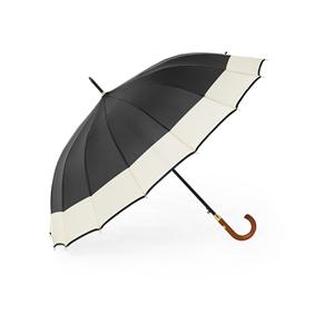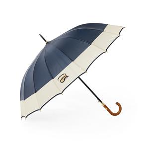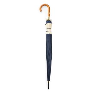 Descrição: Guarda-chuva de poliéster com abertura automática, estrutura metálica com 16 varetas e pegador em madeira.