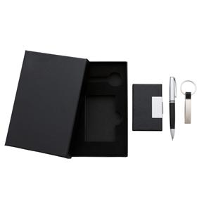 Descrição: Kit executivo 3 peças em estojo de papelão com tampa e parte interna revestida de espuma. Contém: chaveiro metal fosco com detalhe emborrachado preto, Porta-Cartão de couro sintético(verso metálico liso) com placa de metal e caneta metal fosca