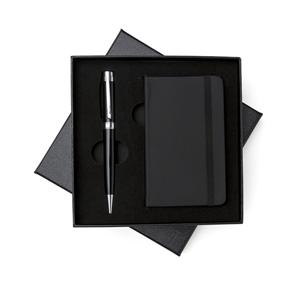 Descrição: Kit executivo 2 peças em estojo de papelão com tampa e parte interna revestida de espuma. Contém: caneta metal preta com anel, detalhes em prata e escrita preta; caderneta emborrachada com aproximadamente 80 folhas amarelas com pauta. Acompanha