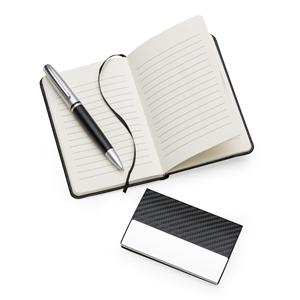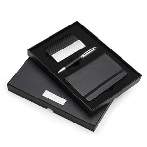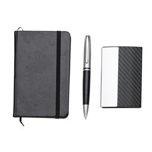 Descrição: Kit executivo 3 peças em estojo de papelão com tampa e parte interna revestida de espuma. Contém: Porta-Cartão de couro sintético texturizado com detalhes prata brilhante, caneta metal fosca com detalhe emborrachado preto, caderneta em couro si