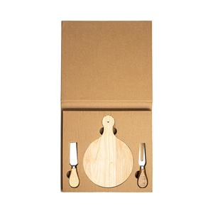Descrição: Kit queijo 3 peças em estojo kraft, contém: tábua de madeira redonda, faca reta, e garfo. Tábua com orifício para encaixe.