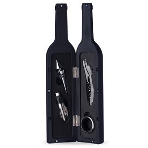 Descrição: Kit vinho formato garrafa com 4 peças: tampa de bico, bico condutor com tampa, Saca-Rolhas metálico com lâmina de corte e abridor de garrafa e wine collar. Estojo com fechamento imantado e área interna com berço de espuma.Altura : 32,4 cm<