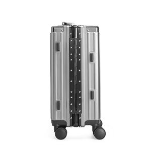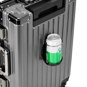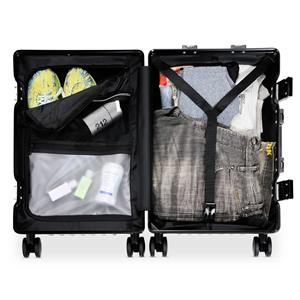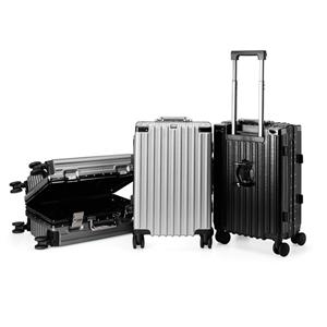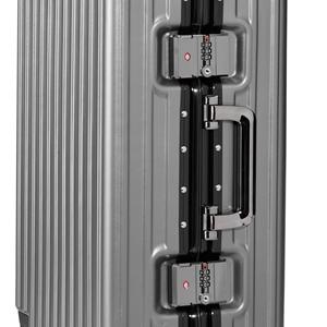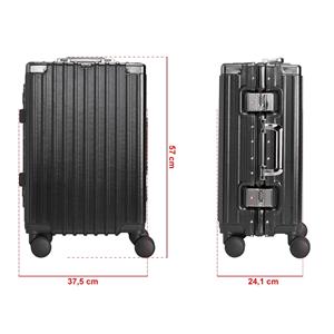 Descrição: Mala de viagem 46 litros feita em plástico com acabamento em alumínio, contém cadeado numérico TSA. Compartimentos internos com bolso telado, bolso plástico para itens molhados e cinta compressora para roupas. A mala possui duas alças de mãos,