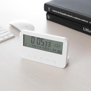 Descrição: Relógio digital com alarme. Produzido em plástico, o relógio possui um display LCD com exibição das horas, dias da semana, data, alarme, relógio de contagem progressiva e regressiva, temperatura, clima e umidade, parte frontal inferior com botõ