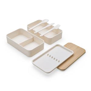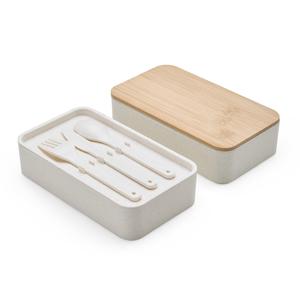 Descrição: Marmita dupla em fibra de trigo livre de BPA, sendo um compartimento de 600ml com tampa de bambu e outro compartimento de 500ml com suporte para talheres de fibra de trigo. Possui uma divisória removível e elástico para um transporte seguro. Ac