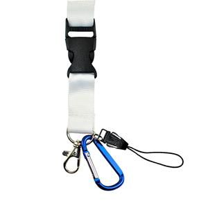 Descrição: Cordão de Pescoço Branco com Mosquetão Azul e suporte de Celular para Sublimação - Tamanho 2 x 53cm