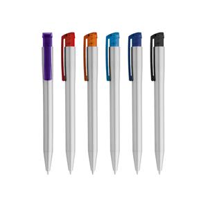 Descrição: Esferográfica em ABS com acabamento metalizado e clipe translúcido colorido. Até 1,5 km de escrita. ø11 x 136 mm