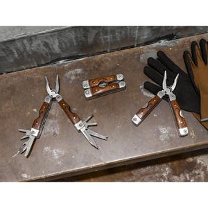 Alicate dobrável com ferramentas multifunções em aço inox e madeira