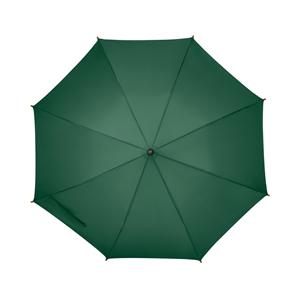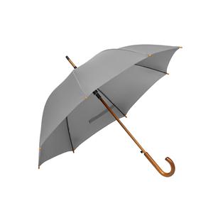 Descrição: Guarda-chuva em poliéster pongee 190T, com abertura automática. Varetas em fibra de vidro, com pega e haste em madeira.