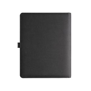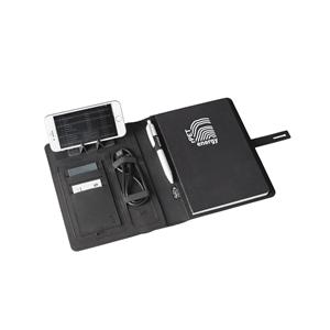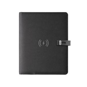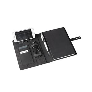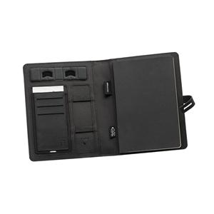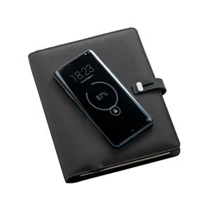 Descrição: Pasta A5 em 300D poliéster reciclado (100% rPET) com carregador wireless embutido. A bateria tem capacidade para 5.000 mAh, potência de 10W, entrada/saída 5V/2.1A e cabo USB tipo C para carregar a bateria. A pasta contém no seu interior um bols