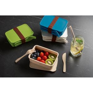 Descrição: Marmita hermética em fibra de bambu (60%) e PP (40%) com compartimento com capacidade até 600 mL. Contém banda elástica com suporte para 2 talheres, inclusos: garfo e faca. Apto para micro- ondas (retirar a tampa). Certificação EU Food Grade.