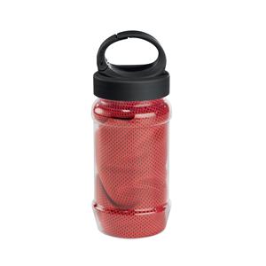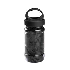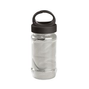 Descrição: Kit toalha e garrafa. Toalha para esporte em poliamida e poliéster. Toalha refrescante, quando molhada permanece fria durante horas. Se aquecer, basta balançar reativando sua frescura. Reutilizável e lavável à máquina. Garrafa em PP e PET com m