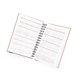 Descrição: Agenda diária 2025 com espiral, material kraft, capa dura. Contém páginas de dados pessoais, calendário 2024 a 2025, orçamento pessoal, anotações, mapa do Brasil, mapa da América do Sul, mapa da América do Norte, mapa Mundi, mapa da Europa, map