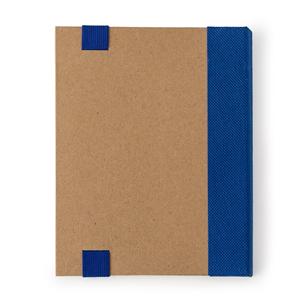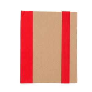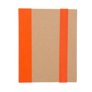 Descrição: Bloco de anotações ecológico com caneta e autoadesivos, material kraft. Possui uma faixa colorida em tnt e fita elástica, parte interna com suporte para caneta de papelão com clip plástico; bloco amarelo médio com aproximadamente 20 folhas; blo