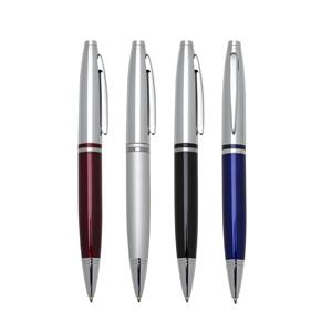 Descrição: Caneta metálica com carga esferográfica azul e acionamento por rotação.