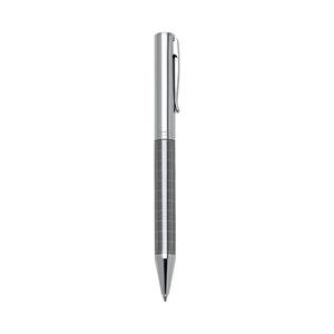 Descrição: Caneta metálica com carga esferográfica azul e acionamento por rotação.