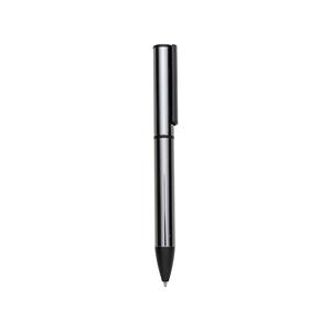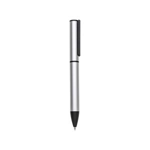 Descrição: Caneta metálica com carga esferográfica azul e acionamento por rotação.