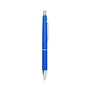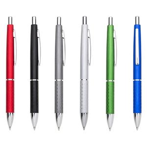 Descrição: Caneta metálica com pintura escovada colorida, possui anel inferior prata e detalhes em relevo semelhante a strass. Acionamento por clique.