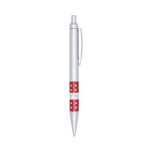Descrição: Caneta plástica com detalhe strass, carga esferográfica azul e acionamento por clique.