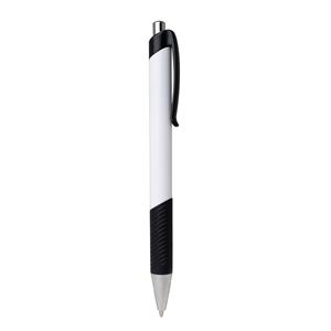 Descrição: Caneta plástica com detalhe emborrachado, carga esferográfica azul e acionamento por clique.