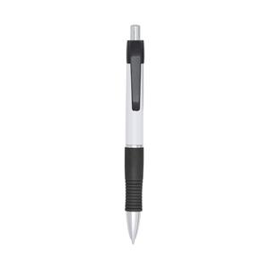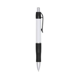 Descrição: Caneta plástica com detalhe emborrachado, carga esferográfica azul e acionamento por clique.