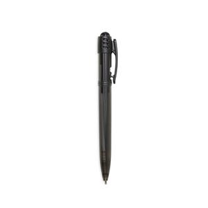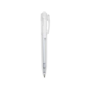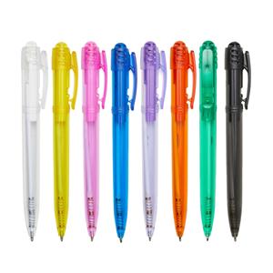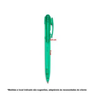 Descrição: Caneta plástica translúcida com carga esferográfica azul e acionamento por clique.