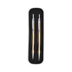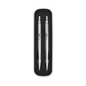 Descrição: Conjunto de caneta e lapiseira metálicas em estojo de metal. Caneta e lapiseira possuem acabamento fosco, detalhe emborrachado na parte inferior, carga esferográfica azul de 1.0mm e acionamento por clique. Estojo revestido em espuma.Largur