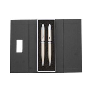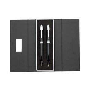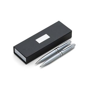 Descrição: Conjunto caneta e lapiseira em estojo de cartonagem com placa central para personalização. Clip metal e anel central possui: anel fino prata, anel preto fino e um anel maior prata com relevo e acionam por giro. Estojo revestida com espuma na pa