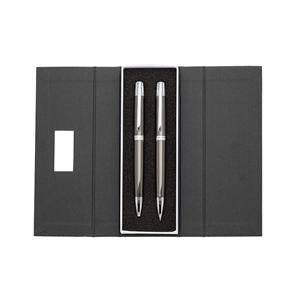 Descrição: Conjunto caneta e lapiseira em estojo de cartonagem com placa central para personalização. Clip metal com dois anéis em relevo, anel centralizado e dois anéis em relevo na ponteira e acionam por giro. Estojo revestida com espuma na parte intern