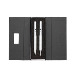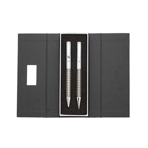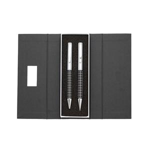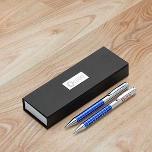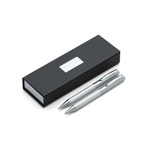 Descrição: Kit caneta e lapiseira de metal em estojo papelão com placa de metal(parte interna do estojo revestida com espuma). Caneta e lapiseira prata com detalhes coloridos e quadriculados, clip metal com anel superior na ponta e dois anéis centrais e a