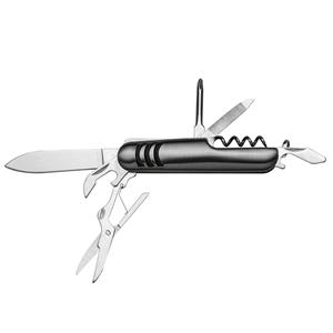 Descrição: Canivete metal 7 funções com detalhes emborrachados preto(três linhas frente e verso). Possui: lâmina de corte, mini tesoura, abridor de lata, abridor de garrafa, chave phillips, lixa e Saca-Rolhas. Acompanha bainha de nylon.Medidas aproxi