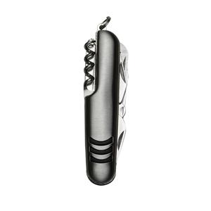 Descrição: Canivete metal 9 funções com detalhes emborrachados preto(três linhas frente e verso). Possui: lâmina de corte, serrilha, mini tesoura, abridor de latas, abridor de garrafa, chave phillips, lixa, agulha de sutura e Saca-Rolhas. Acompanha bainha