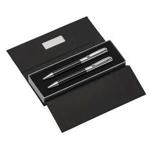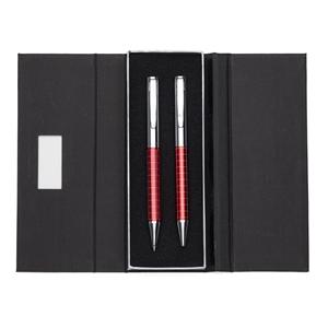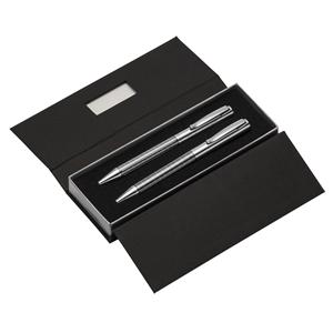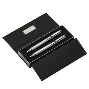 Descrição: Kit caneta e lapiseira de metal em estojo papelão com placa de metal(parte interna do estojo revestida com espuma). Caneta e lapiseira prata com detalhes coloridos e quadriculados, clip metal com anel superior na ponta e dois anéis centrais e a