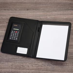 Descrição: Pasta convenção de couro sintético, possui calculadora solar plástica de 8 dígitos, suporte para cartão, suporte com visor para cartão de identificação, suporte para arquivar documentos, suporte para caneta(não acompanha caneta) e bloco com 20