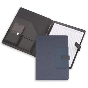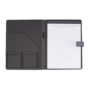 Descrição: Pasta convenção com bloco para anotações. Pasta confeccionada em material sintético, possui fecho imantado com plaquinha emborrachada, “bolso” interno para arquivar documentos, suporte para cartões, celulares e caneta, além de um bloco com folh