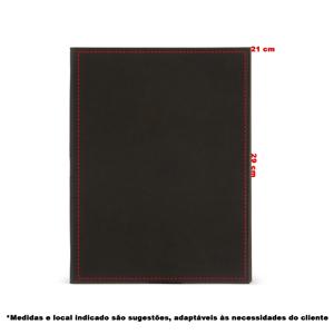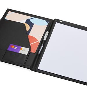 Descrição: Pasta convenção de couro sintético, possui Porta-Caneta, compartimento para arquivar documentos, dois bolsos para cartões e um bloco com aproximadamente 25 folhas brancas não pautadas.