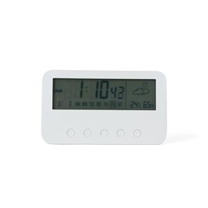 Descrição: Relógio digital com alarme. Produzido em plástico, o relógio possui um display LCD com exibição das horas, dias da semana, data, alarme, relógio de contagem progressiva e regressiva, temperatura, clima e umidade, parte frontal inferior com botõ