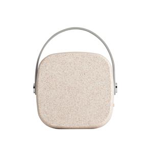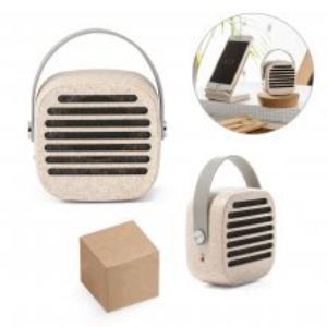 Descrição: Caixa de som portátil em fibra de palha de trigo e ABS com alça em silicone para facilitar o transporte, potência de 3W e transmissão sem fios BT v5.0. Bateria com 500 mAh e autonomia aproximada de 4h30. Incluso cabo USB. Fornecido em caixa pre