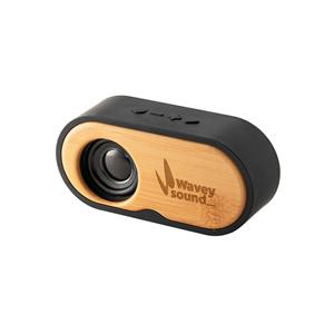 Descrição: Caixa de som portátil com microfone, em bambu e ABS 100% reciclado com potência de 3W e transmissão sem fios BT v5.0. Autonomia aproximada de 5h com uma bateria de 1200 mAh. Fornecido em caixa presente de papel kraft. A cor e o resultado da imp